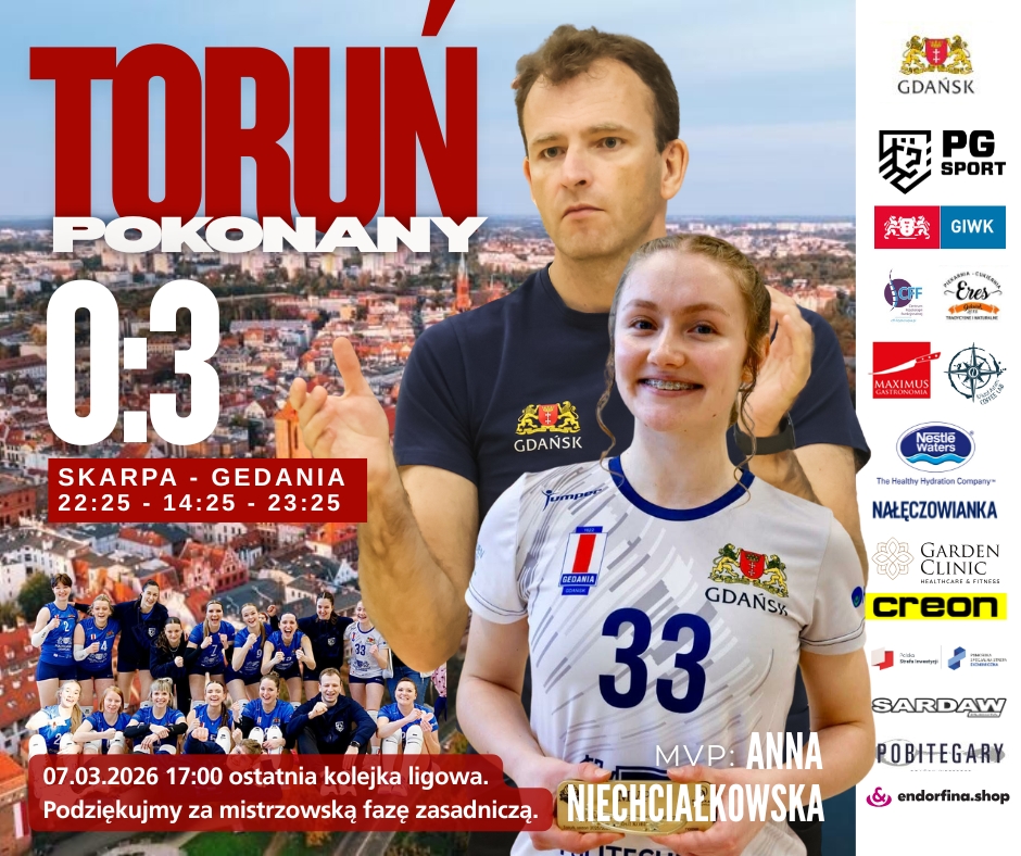 Został już tylko jeden mecz sezonu zasadniczego. Dzisiaj pokonujemy na wyjeździe Skarpę Toruń i podtrzymujemy serię bez porażki. MVP: Anna Niechciałkowska (Libero)m Teraz za tydzień wypełniamy halę i pod nadzorem chwilę świętujemy, przed jeszcze cięższą pracą.