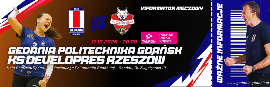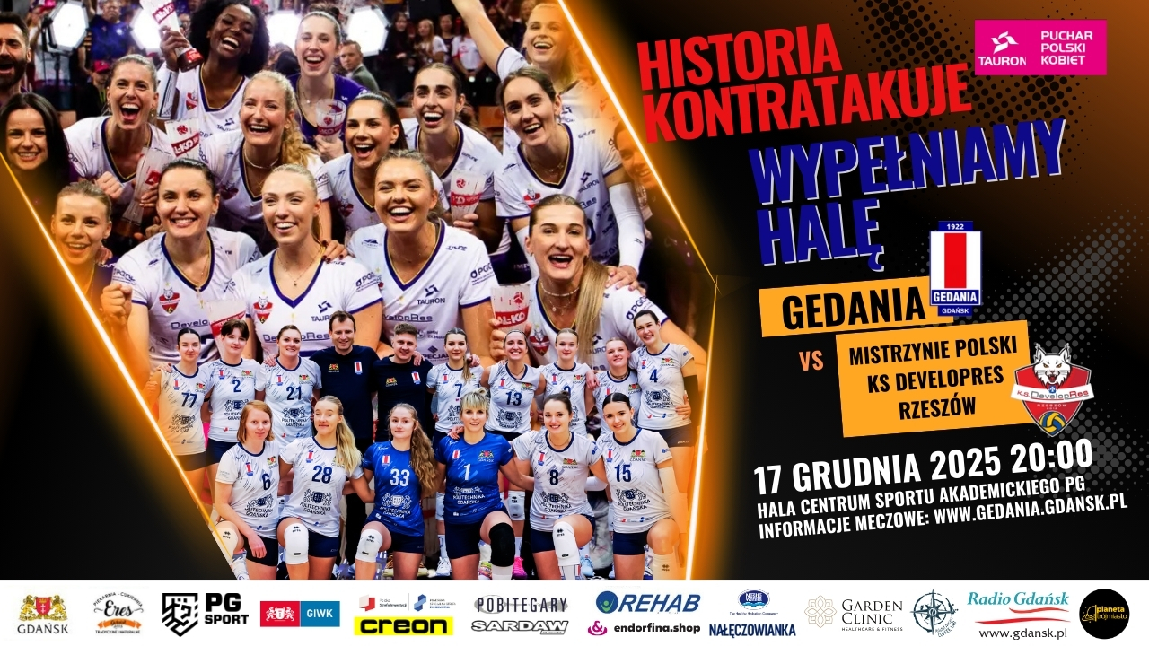 W środę (17.12.2025) czeka nas prawdziwe siatkówkowe święto! Gedania Politechnika Gdańsk zagra w 1/8 finału Tauron Pucharu Polski kobiet z… aktualnymi mistrzyniami Polski i uczestniczkami elitarnej Ligi Mistrzów! To będzie mecz na najwyższym poziomie, a nasze dziewczyny jadą jak burza i są gotowe na wyzwanie. Nie można tego przegapić!
